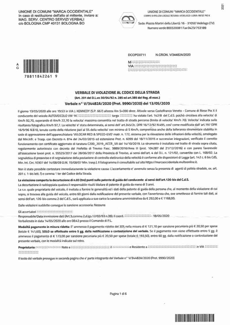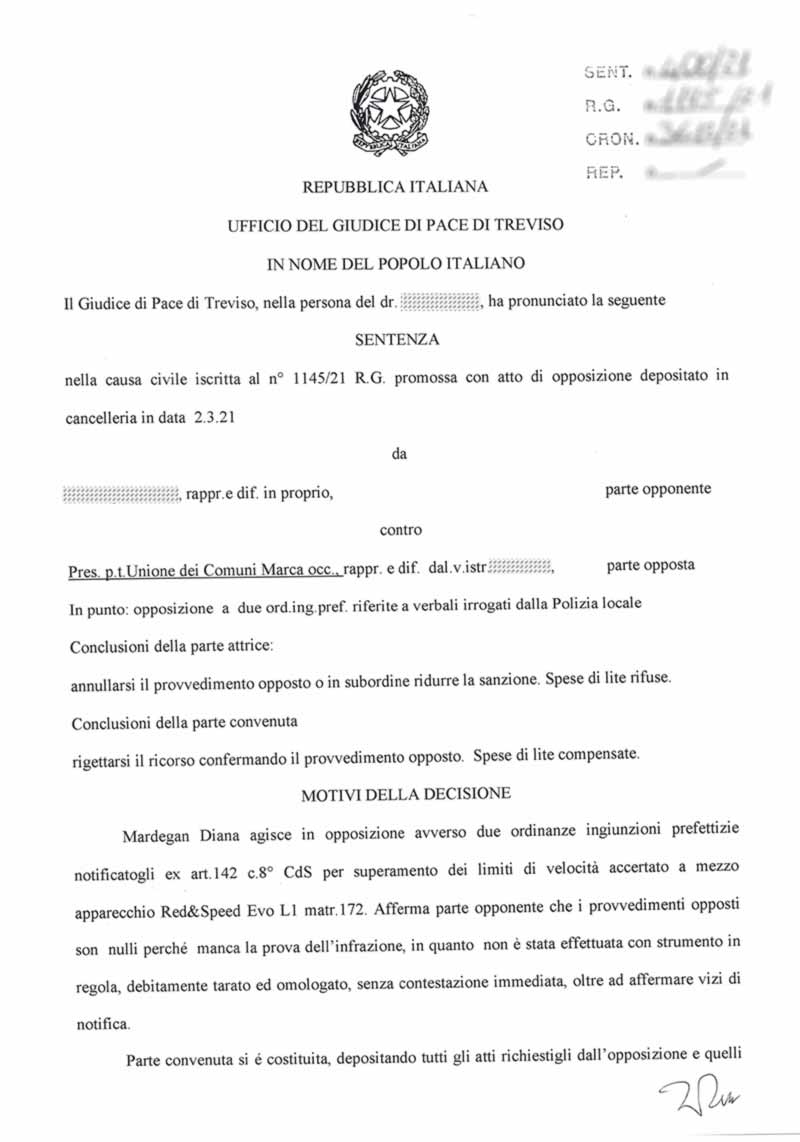 Pubblichiamo qui di seguito il testo integrale della sentenza emessa dal Giudice di Pace di Treviso che ha accolto il nostro ricorso, disponendo l’annullamento della multa per eccesso di velocità rilevata dal comando di polizia dell’Unione dei Comuni Marca Occidentale. In particolare, l’autovelox in questione è il modello Velocar Red & Speed-EVO (matr. 172), collocato nel Comune di Riese Pio X, al Viale Kennedy (S.P. 667) all’altezza del km 5+390 in direzione Altivole verso Castelfranco Veneto.