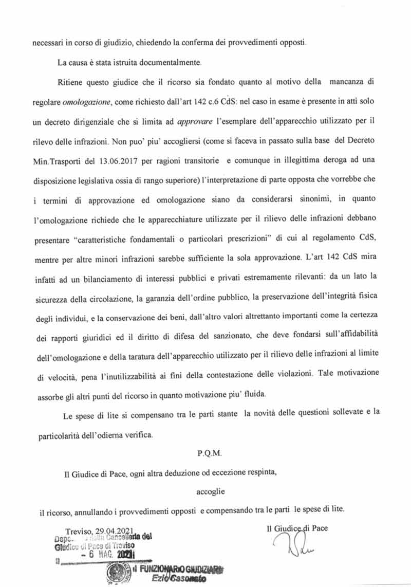 Il Giudice di Pace di Treviso ha accolto il ricorso unicamente basandosi sull’eccezione relativa alla mancata omologazione del dispositivo, sebbene nel nostro elaborato avessimo evidenziato numerose altre incongruità (in merito alle modalità di notifica e ala visibilità dell’autovelox).